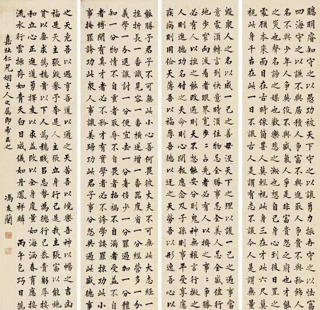 冯友兰的书法,楷行隶篆诸体皆能,虽不及同时期一些专业书法家的字,但仍是值得欣赏的,毕竟作为一名致力于哲学、教育的人,自然不会将时间和精力放在书法这类“末技”上,书法对于他来讲不过是表达、承载思想情感的一种形式罢了。整体而言,冯友兰的书法还是有着不错的传统根基的。