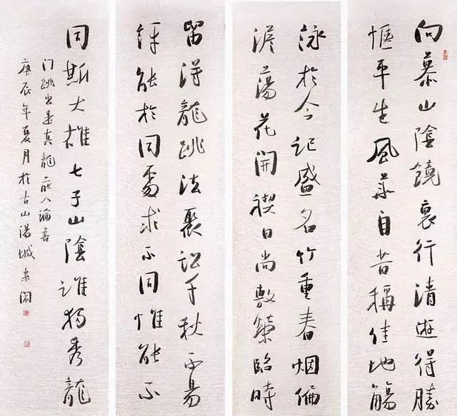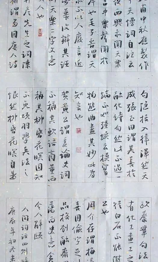 从他的作品上看,用笔上甚为讲究,而且出入皆法,法度严谨,做到了八面出锋,每一笔,每一划,似乎都是经过精心雕琢过的,点画之间的关系处理得非常精到,不仅相互之间有所避让,而且还有相互之间的联系,形成一种前后照应,前顾后盼的关系,关系十分融洽,尤其是在上下笔之间的联系上,笔意始终相连,彼此相通,写出了一番新气象,这也是在其他书法家的行书上很难看到的景象,难怪能够赢得首届兰亭奖评委们的“芳心”,也是实力所致。